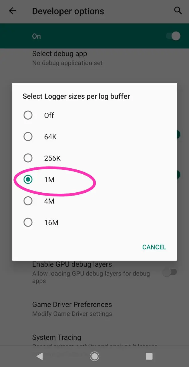 이 경우 실제 연결된 디바이스 개발자 옵션 > 로그 버퍼 사이즈 선택 으로 들어가서 "사용하지 않음"으로 되어 있는지 확인하면 좋습니다. 로그 버퍼 사이즈가 안드로이드 스튜디오 로그캣과 연결되어 있기 때문에 개발자가 로그를 사용한 정도에 따라 버퍼 사이즈를 선택해야 합니다. 제 경우 1M만큼 설정하였습니다.