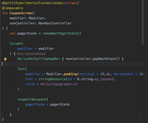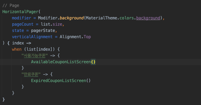 pager도 앞 서 보았던 CouponTabLayout에 선언하였다. TabRow 블럭 밑에 작성하면 된다.