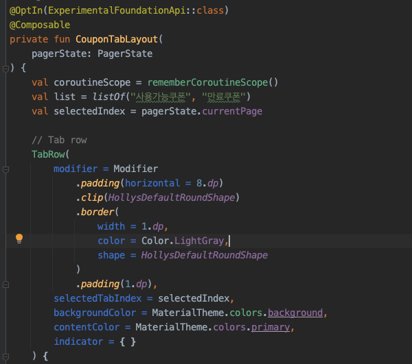 TabRow는 함수를 사용할 때, 속성을 설정하는 Modifier, 선택 Index, Indicator 등을 정의했다. TabRow Modifier의 padding은 바깥에 존재하는 다른 Compose View 와의 Margin 값으로서 사용하였고, clip은 TabRow에 둥근 모서리를 적용하기 위한 Shape를 선언하였다. border 안에 shape 속성은 clip과 같은 Shape를 사용해야 모서리에도 둥글게 border가 그려지는 것에 주의한다. border를 덮지 않기 위해 마지막으로 padding을 border의 width만큼 추가하였다. content color는 선택되었을 때 색깔을 의미하고, indicator는 선택하였을 때 TabRow의 밑줄 표시를 custom할 수 있는 속성이다. XML View의 TabLayout을 사용한 적이 있다면, 바로 알 수 있는 속성이다. 밑줄 표시가 Default이기 때문에, 사용하지 않으려면 빈 값을 넣어야 한다.