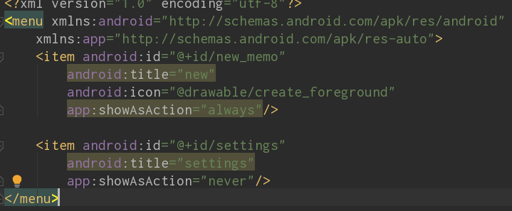 app:showAsAction라는 속성으로 AppBar에 내놓을지 점점점 안에 숨길지를 정할 수 있습니다.