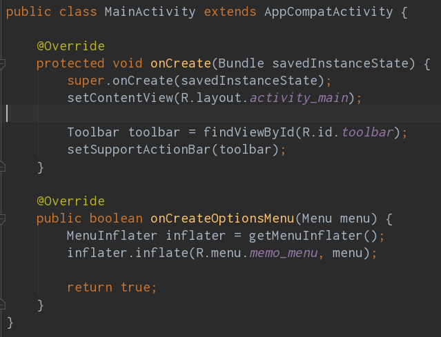 방금 만든 memo_menu.xml 파일을 inflate해주면 되겠습니다.