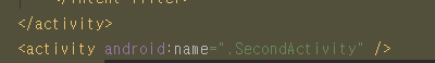 마지막으로 우리가 만든 SecondActivity를 사용하겠다고 앱에 알려주는 작업이 필요합니다.