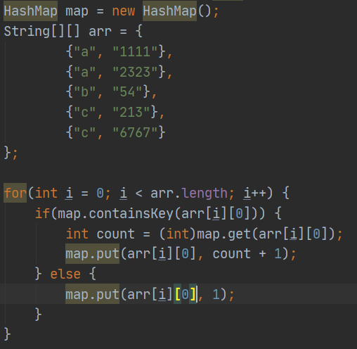 String 1차원 배열 안에 중복된 값들이 몇 개 들어있습니다. 어떤 값이 얼마나 중복되었는지를 확인하기 위해 HashMap 객체를 하나 생성한 후 String arr의 요소를 key값으로 가지고 있는지 확인합니다. 만약 없다면 처음 본 요소이기 때문에 값을 1로 설정하고 이미 key값으로 가지고 있다면 이전 index에서 이미 key값으로 설정했다는 뜻입니다. key값은 중복을 허용하지 않기 때문에 해당 key값의 value를 +1 합니다.