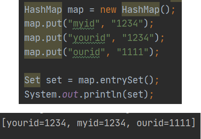 위에서 put메서드 설명을 위해 만들었던 코드에 entrySet을 추가하여 print해봤습니다. key와 value가 결합된 형식이 put을 한 순서와 상관없이 출력되는 것을 볼 수 있습니다.