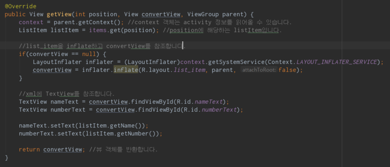 설명은 주석으로 대체하겠습니다. getView()메서드는 데이터를 가지고 있는 View객체를 반환합니다.