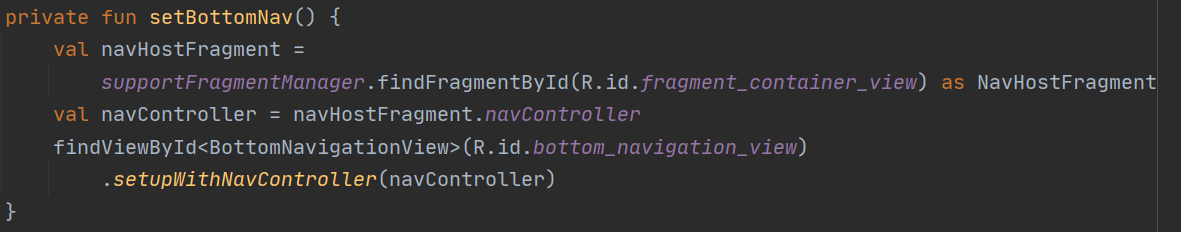 함수를 하나 생성해서 코드를 분리했습니다. 이미 container view, bottom navigation, nav graph를 xml 안에서 연결하였습니다.