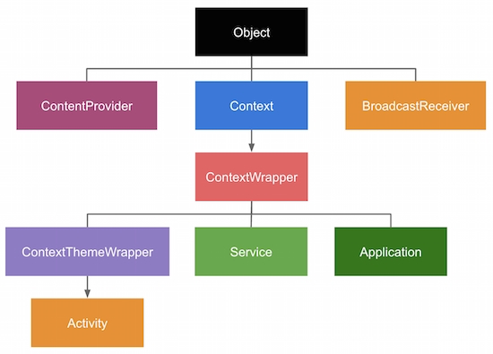 Context는 abstract class이기 때문에 독자적으로 사용될 수 없고 ContextWrapper라는 구현체를 통해서 구현된다. ContextWrapper는 사용자들에게 노출되지 않는다. Application, Activity, Service는 Context라는 추상 클래스를 상속받은 구현체들이다. 앱 내에는 여러 개의 ActivityContext, ServiceContext가 존재할 수 있지만, ApplicationContext는 단 하나만 가지게 된다. 그 이유는 하나의 앱 안에서 Application class를 상속받는 클래스 객체가 단 하나이며, Activity, Service class를 상속받는 클래스 객체는 여러 개일 수 있기 때문이다.
