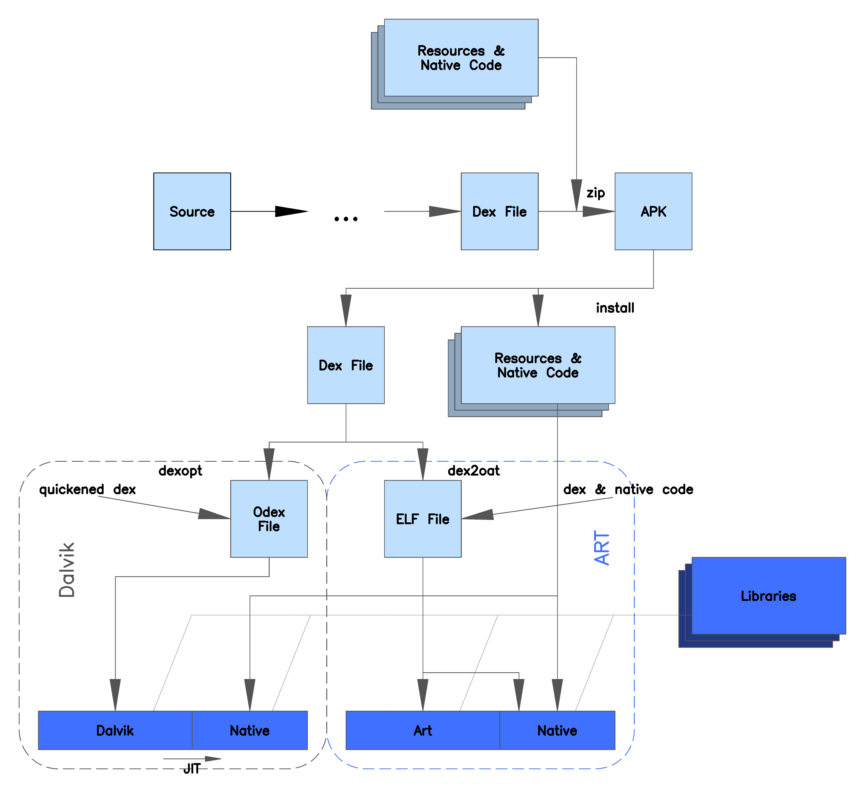 - AOT(Ahead-Of-Time) 컴파일 : ART는 앱 성능을 개선할 수 있도록 AOT 컴파일을 사용합니다. AOT 컴파일은 일부 코드는 프로세스를 실행할 때 컴파일한다는 뜻입니다. 먼저 중간 언어 형태로 배포한 후 해당 시스템에서 인터프리터나 JIT 컴파일러를 통해 기계어 번역을 실행하여 실행되는 중간에 해당 시스템아 맞는 기계어로 번역하는 것입니다. 이렇게 했을 경우 오직 실행 시에만 얻을 수 있는 프로그램 분석 정보를 활용할 수 있어, 더 높은 성능을 제공한다는 장점이 존재합니다. 또한, 기존에 사용했던 JIT(Just-In-Time) 컴파일의 경우 앱을 다운로드할 때, 모든 코드를 컴파일하였다면 AOT는 실행 중에 컴파일하기 때문에 다운로드 시간이 줄어듭니다. 반면에 실행 시 프로그램 분석과 컴파일을 함께 수행하기 때문에 추가적으로 메모리와 CPU 사이클이 필요하다는 단점이 존재합니다.