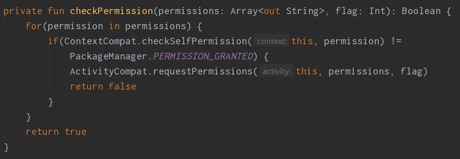 위에 두 array는 Manifest.xml 파일에서 요청한 권한을 상수로 나타낸 것입니다. 카메라와 저장소 권한을 저런식으로 배열에 담을 수 있습니다. 나중에 확인을 위해 사용할 수 있습니다.