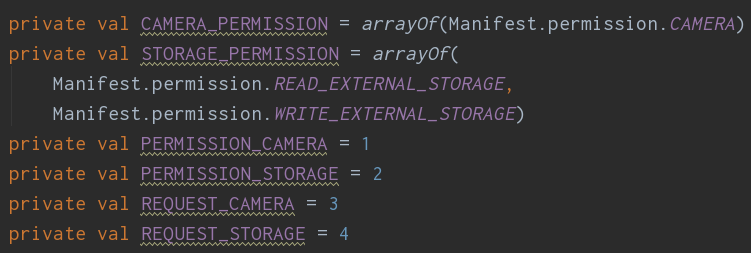 MainActivity에서 카메라와 저장소 권한에 대해서 확인합니다. 승인한 것이 확인되면 해당 기능이 작동하고 거절되었다면 앱을 종료하거나 다른 조치를 취하도록 합니다. 먼저 읽기 전용 상수를 선언하겠습니다.