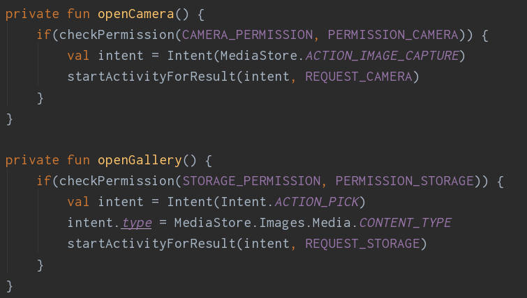이번에는 Intent를 사용해서 카메라와 갤러리에 접근하는 함수를 작성합니다.