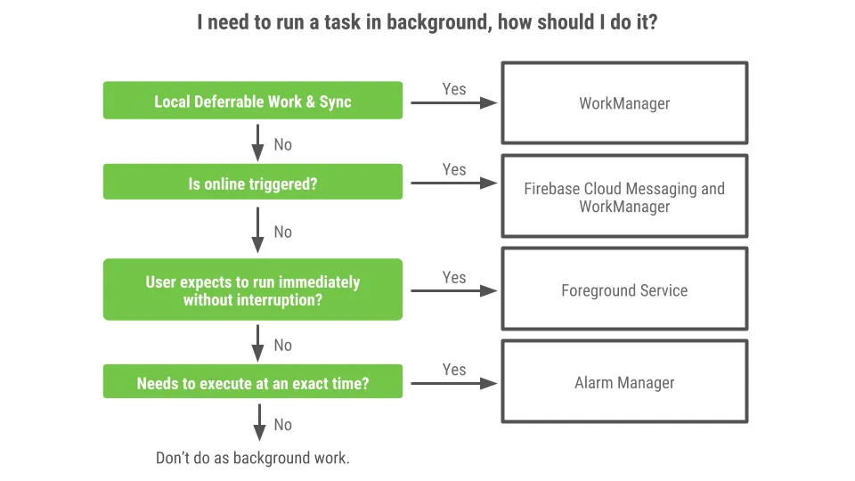 Android에는 보장된 백그라운드 작업을 위한 다수의 옵션이 있으며, 이러한 옵션에는 각각 다양한 장단점이 있습니다. Android용 WorkManager API는 백그라운드 작업을 간편하게 만듭니다. WorkManager는 예