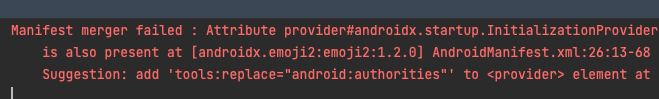다중 Manifest 파일을 병합하는 과정에서 발생하는 오류입니다. 다중 Manifest 파일이라 걸릴 만한 부분은 application ID 부분입니다. Clean Architecture로 앱을 디자인하였기 때문에 app, data, domain 으로 나뉘어 있는데 이는 세 개의 application ID가 있음을 뜻합니다. 안드로이드 스튜디오가 제안한 대로 “tools:replace=androud:authorities”를 추가하여 오류를 해결할 수 있습니다.