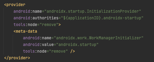 WorkerFacktory를 커스텀 초기화 할 것이기 때문에 Default 초기화를 하지 않겠다고 AndroidManifest.xml에 명시해야 합니다.