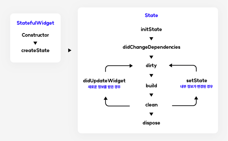 - 상태란, 위젯이 완성될 때 동기적으로 읽을 수 있는 정보이며, 위젯의 수명 동안 변경될 수 있는 정보이다.