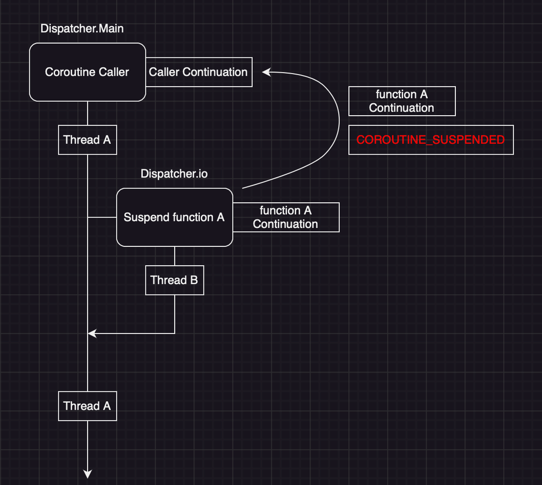 Continuation이 필요한 이유 중 한 가지는 스레드이다. JVM은 스레드를 차단하지 않고 함수 내부에서 기다릴 수 없다. 그렇기 때문에 Continuation 객체가 전달되면서 suspend 함수 안에서 COROUTINE_SUSPENDED 라는 특수한 값을 즉시 리턴한다. 특수한 값이 리턴되면 해당 로직이 실행되고 있는 스레드를 Free 상태로 만들면서 이 스레드는 중단되지 않고 다른 일을 처리할 수 있게 되는 것이다. 예를 들어, 스레드 A가 Free 상태가 되면 그 자리를 스레드 B로 대체하여 suspend 함수는 스레드 B에서 실행되고 스레드 A는 다른 일을 한다.
